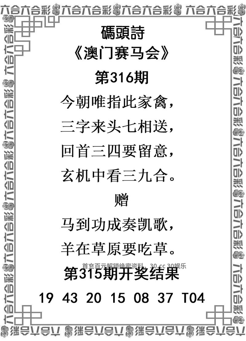 | 316期 | 猪牛鼠马 | 开:马24 |
